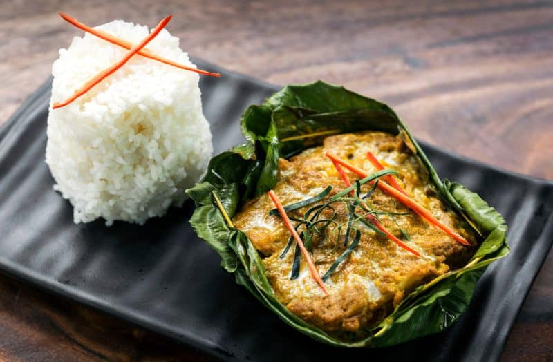 - Amok is where it’s at. I ate many amok in my time in Cambodia. Most frequently prepared with fish, it not uncommon to see it with chicken or pork. This dish is traditionally gluten free (and delicious), but as always confirm before you consume. It’s served with steamed rice.