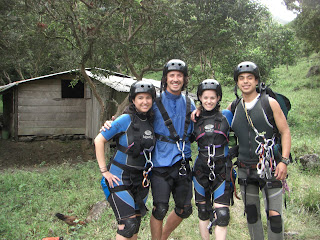 Jess, Phil, me and our canyoning guide, Franklin, pre-canyoning, Jess and me below our 2nd waterfall and one of the waterfalls along la Ruta de las Cascadas: